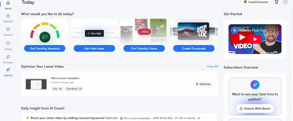 vidIQ → essential YouTube assistant for keyword research, ideas, and channel growth.