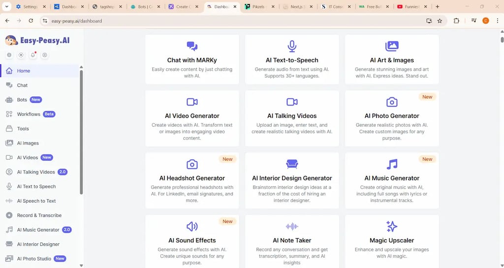 Easy-Peasy AI is perfect when you want quick writing without thinking too much. It includes templates for blogs, emails, Instagram captions, YouTube descriptions, ads, rewriting, summaries, product descriptions, and more — all in a clean, beginner-friendly interface.