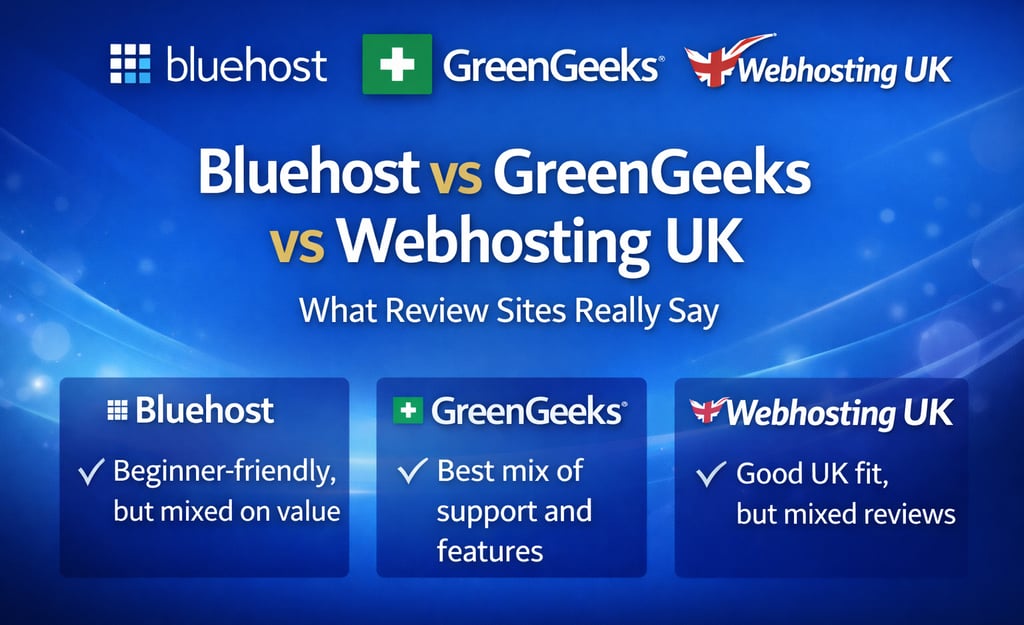 A review-based comparison of Bluehost, GreenGeeks, and Webhosting UK. See the recurring pros, complaints, and which host looks best for beginners, value, and UK-focused users. Suggested slug