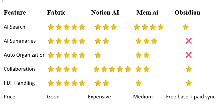 With powerful features like AI search, document summarization, auto-organization, and real-time collaboration, Fabric can easily replace tools like Notion AI, Obsidian, Mem.ai, and even part of ChatGPT.